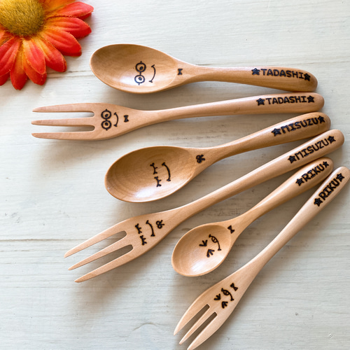 - キッチン・食器 > カトラリー(スプーン等) > 名前入り カトラリー スプーン ハンドメイド プレゼント お祝い オーダー 名前入りスプーンフォークセット♪ ウッドバーニング 名入れ 木製